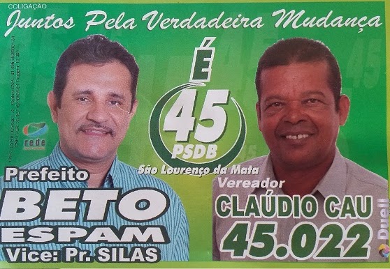 Sou Cláudio - CAU - 45022, estou com BETO DO ESPAM - 45, para juntos implantarmos uma gestão para o povo do Parque Capibaribe, para o povo de São Lourenço da mata, afinal: